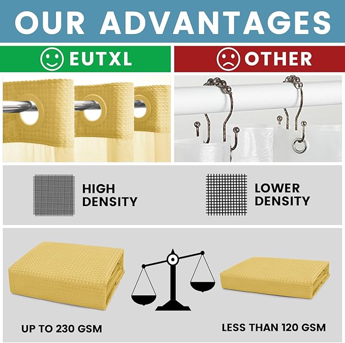 - 【Thick "Cotton" Type Fabric Shower Curtain】Made from expertly chosen and tested Heavyweight Polyester Fabric, touches like a cotton feel. 230GSM (Gram Per Square Meter), about 0.8 pounds heavier than normal 90GSM fabric shower curtains; Honeycomb waffle weave pattern adds elegance to your bathroom
