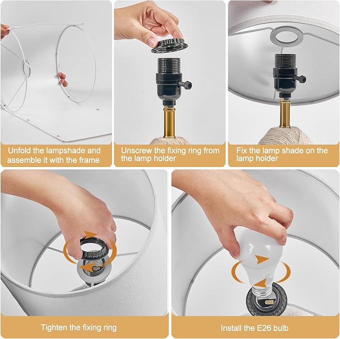 - Simple Installation: Setting up this modern desk lamp is a breeze—just screw together all parts of the lamp pole as per the instructions. The lamp's cord, socket, and plug are UL listed for safe everyday use. What sets this lamp apart is its compatibility with smart light bulbs (included), offering added convenience and enhancing your home's intelligence. Plus, the handmade cotton and linen upper adds a charming artisanal touch.