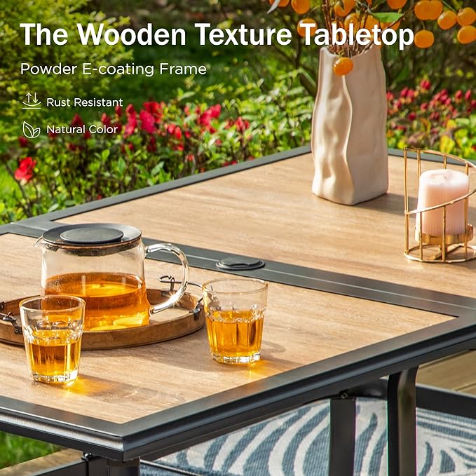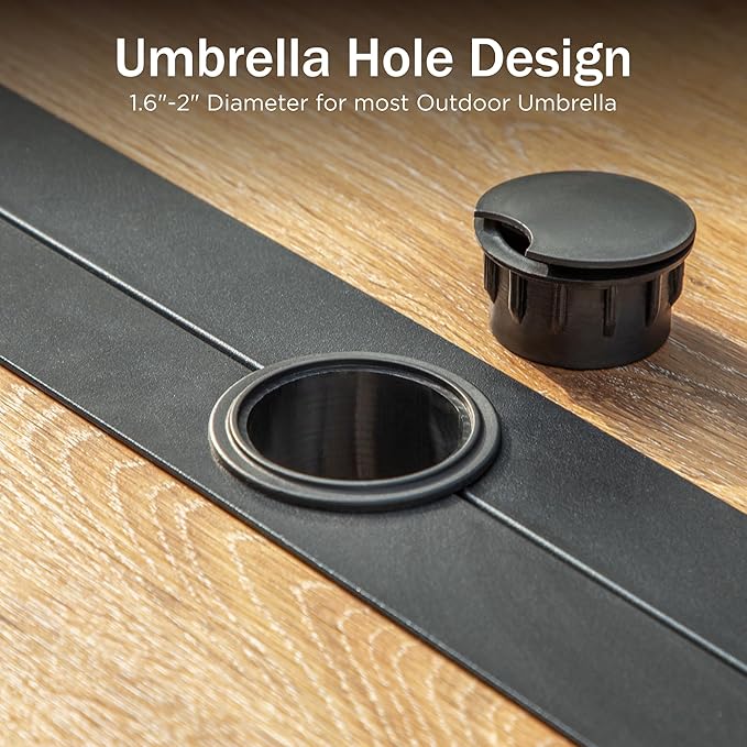 - Wooden-Like Top Dining Table : The 6 person dining table features metal steel frame and premium PVC wooden-like table top, which can bear all weather elements and easy to clean. With umbrella hole fits most umbrellas that pole dia 1.6"-2.0" Umbrella Hole
