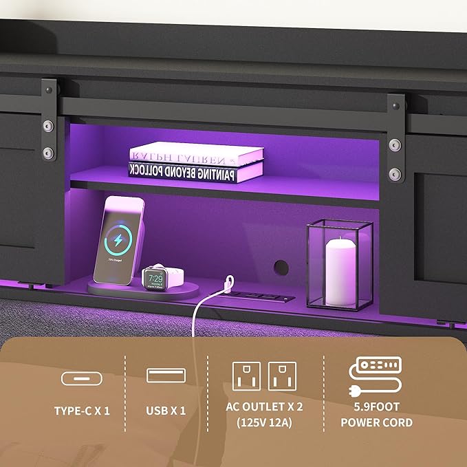 Decoholic Queen Size Headboard Only with Storage, Upholstered Headboard with Charging Station and LED Light, Sturdy and Stable, Easy to Assemble (Black+Barn Door, Queen)