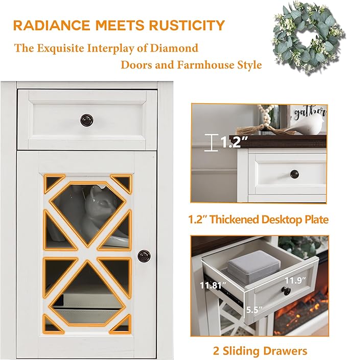 - Farmhouse Classic Design: Embrace rustic charm and sophistication with farmhouse-inspired fireplace TV stand featuring diamond panel doors. This exquisite design merges timeless elegance with the cozy warmth of a 36-inch large screen fireplace. Whether your space boasts a classic, contemporary, or eclectic vibe, our fireplace TV stand becomes a harmonious addition that elevates your decor.