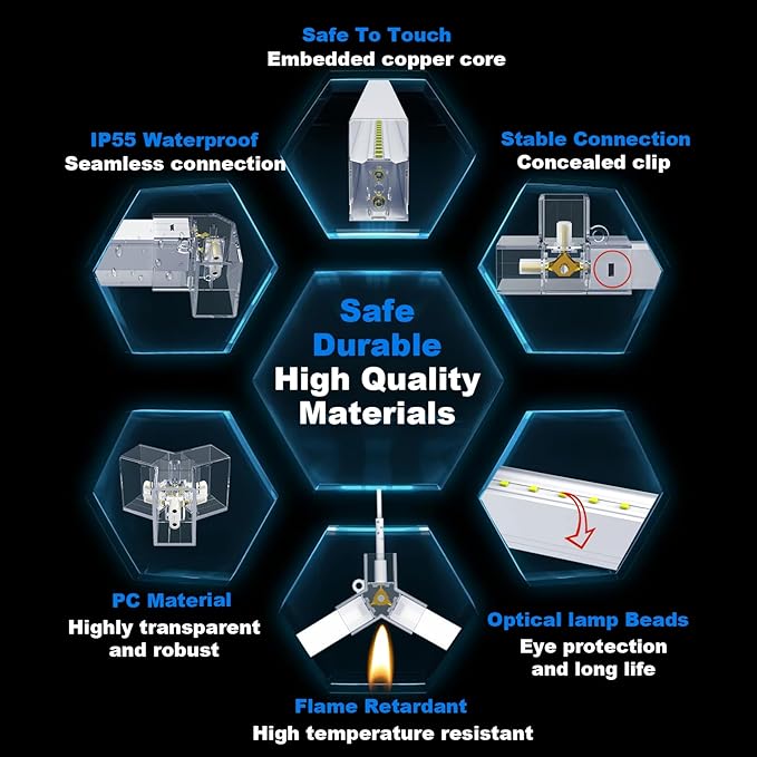 - 【Safe Connection Design】 Hexagonal Garage LED Light adopts an embedded connection design. This design securely hides electrical components within the product structure, eliminating the risk of electric shock. Hexagon garage led light transmissive layer is made of high-quality PC material, making it durable and lightweight to ensure long-lasting performance without burdening the ceiling, providing safety and reliability