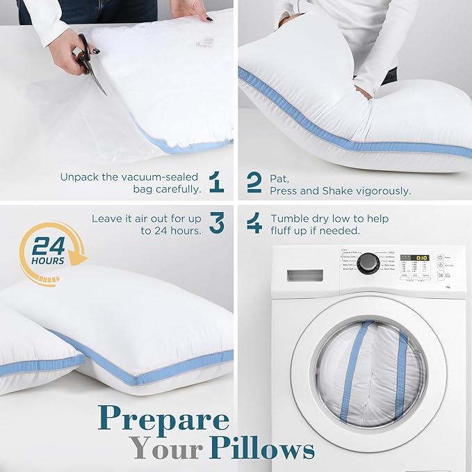 - Hassle-free Use: Made of machine-washable and dryer-friendly materials, this pillow set is easy to maintain and will bloom like new even with repeated cleaning. King pillows 2 pack come vacuum-sealed and expand quickly to full size within 24 hours