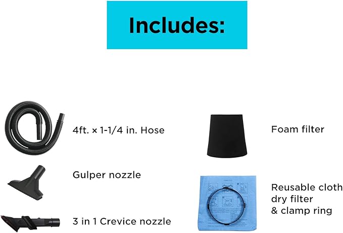 - ACCESSORIES - 1-1/4"x4' Hose * 1, Foam filter * 1, Reuseable filter * 1, Gulper nozzle * 1, Crevice nozzle * 1 (accessories in tank on arrival)
