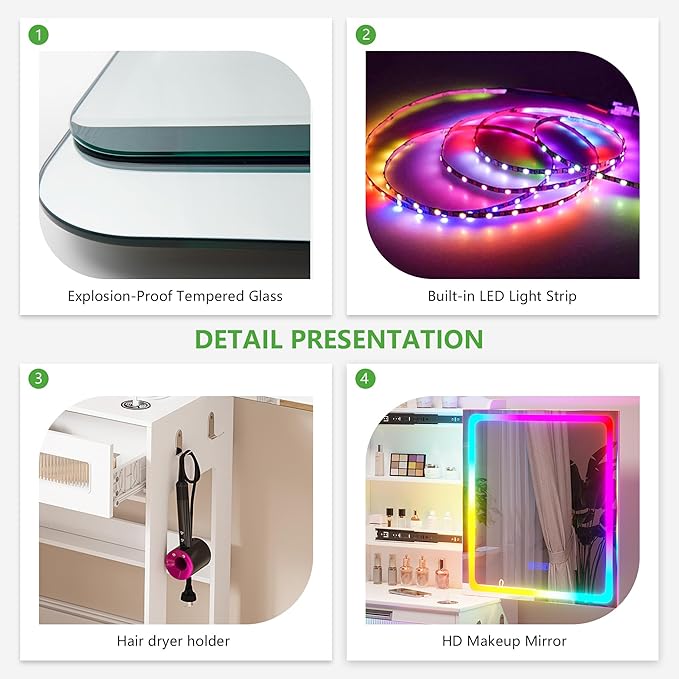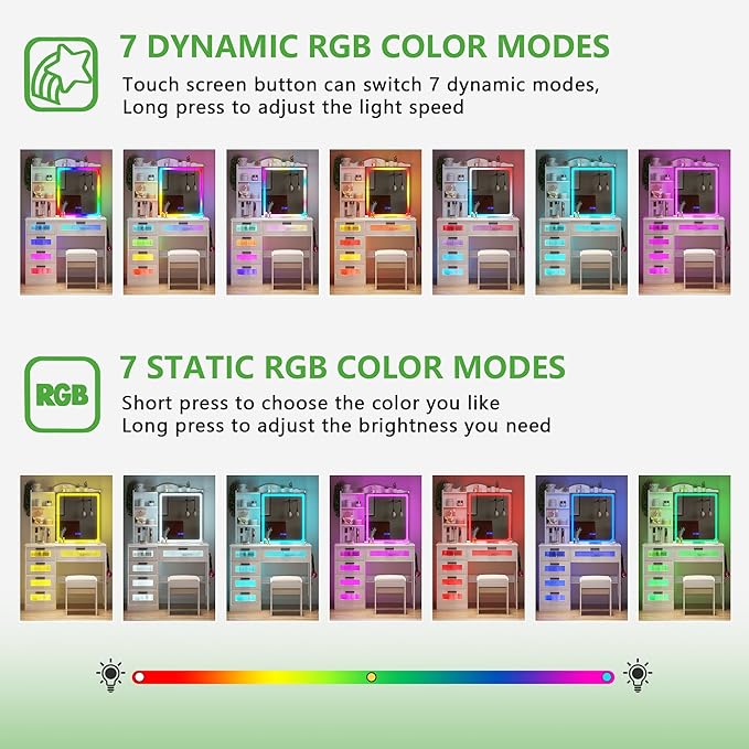 HNEBC Vanity Desk with Sliding Mirror and LED Lights, RGB Vanitys with Charging Station, Makeup Vanitys with Remote Control, White Dresser with Stool/Lager Drawers for Bedroom (White)