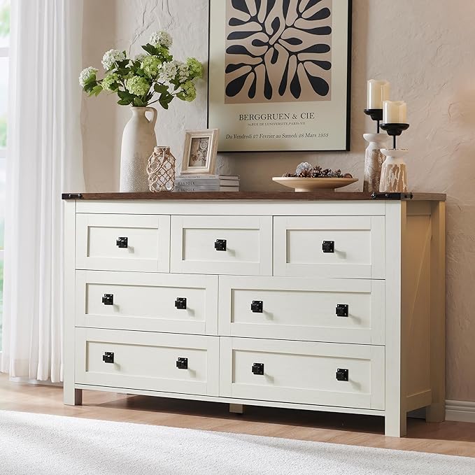- Farmhouse 7-Drawer Dresser: Natural and warm antique finishes may display natural weathering, unique cracks, splits, or other organic features, giving every piece a unique look, and adding a touch of a homey and rustic farmhouse aesthetic to your space while a fluent linear border on the drawer faces, hand-rubbed burnished hardware, and a classic barn sign on the side provide sophisticated architectural detailing. You’ll love living with them for years to come!