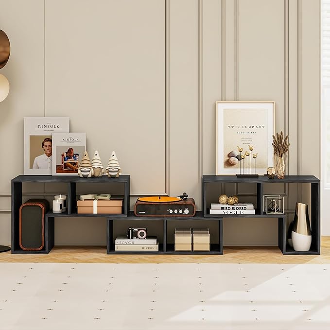 - [Spacious Open Storage Space]: The TV console table is designed with 6 open compartments to classify the storage space and keep things organized. The tabletop is roomy enough to expand from 53" - 67" to accommodate flat-screen TVs up to 65". The open design is perfect for showing and easy fetching.