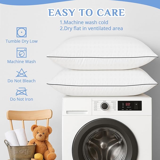 - Convenient Care: Our bed pillows are machine washable and dryer-safe on low heat—making it simple to keep them fresh and fluffed. For optimal results, wash cold on gentle cycle and tumble dry low, no bleach or ironing