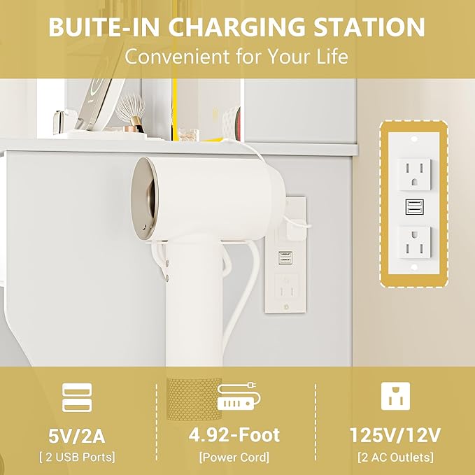 - 【Convenient Power Strips & Hair Dryer Rack】The cute vanity is equipped with a built-in charging station, including 2 AC outlets and 2 USB ports, through which you can charge and use electronic devices at the same time. In addition, our small vanity desk provides you with a hair dryer rack to keep your hair dryer and hair curler within arm’s reach