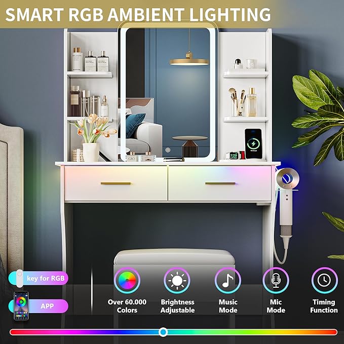 - 【Smart RGB Ambient Light】This white/black vanity is equipped with an RGB lighting system under the tabletop, which can be controlled via APP & button. With over 60,000 static colors available and multiple lighting modes, the system can synchronize to music for a stunning visual experience while you relax or entertain