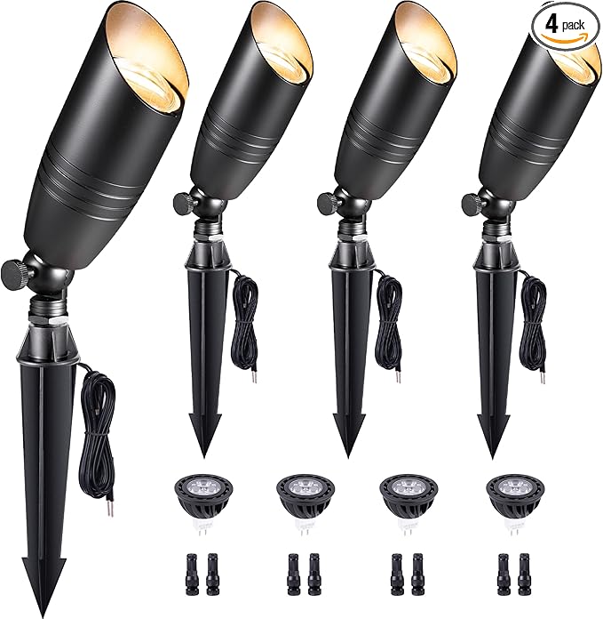 Brass Landscape Lighting - Black Low Voltage Spotlights Outdoor LED, 12V Wired Uplights, Waterproof Spot Lights for Outside Trees with 5W 5000K Daylight MR16 Bulb (4 Pack)