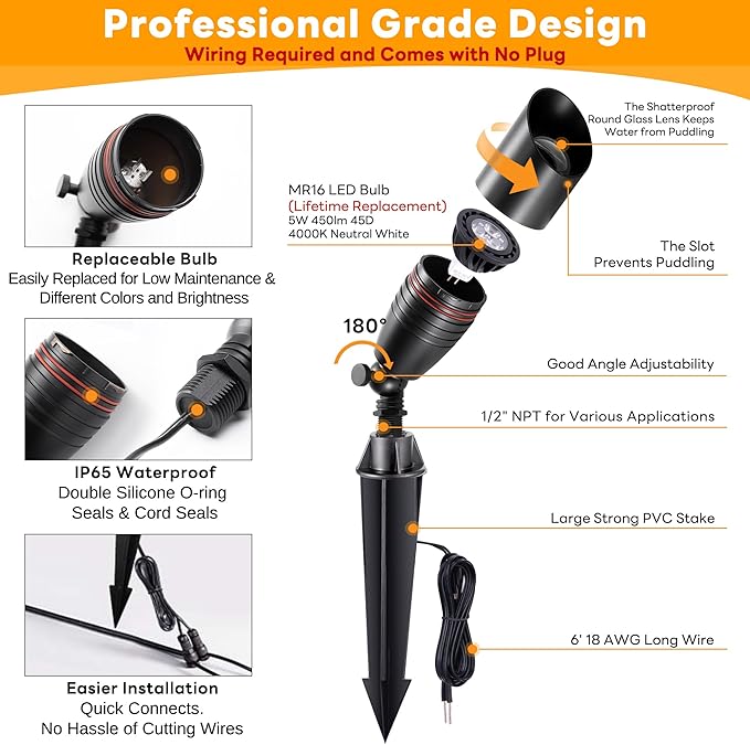 - ๐๐ซ๐ข๐ ๐ก๐ญ: Outdoor spotlight with a 5 watt LED MR16 bulb (450lm). Lights up exterior trees, walls, flags, and fountains up to 10-12 ft. 180ยฐ adjustable while the ground stake stays in place