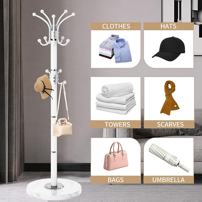 - 16 HOOKS MEET DAILY NEEDS: This modern coat rack features 10 rotatable hooks and 6 extra waist hooks. Make full use of the space to meet the hangings need of winter jackets, briefcases, hats and more. Each hook has exquisite rounded small ball refinement to take care of your clothes. Not only a practical tool for hanging clothes, briefcases and coats, but also a beautiful decoration for your room and office. The coat tree freestanding can be placed in the entrance, living room, bedroom, office and the corner you need
