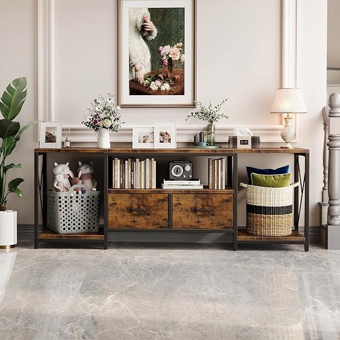 - [Ample Storage Space]: This tv console has 3 tiers open shelves and 2 fabric drawers, provides ample space to organize and display your media equipment, gaming consoles, DVDs, Xbox, PS4 and more
