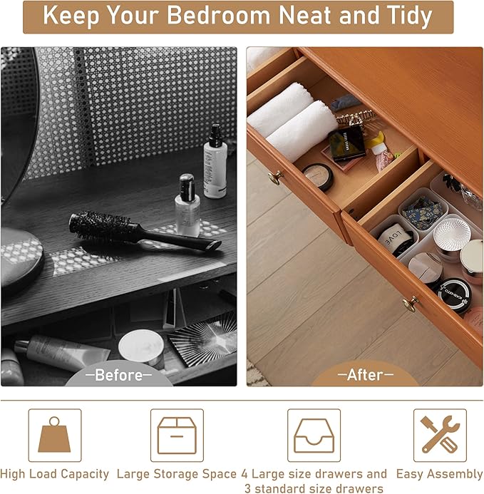 - Stable and Sturdy: Bedroom dresser is made of high-quality and durable MDF and particle board, in addition, the 1-inch thick table top and 3.34-inch high wooden support base ensure this wood dresser has excellent stability, durability and large Load-bearing capacity. ( it can support up to 100 pounds on the tabletop).