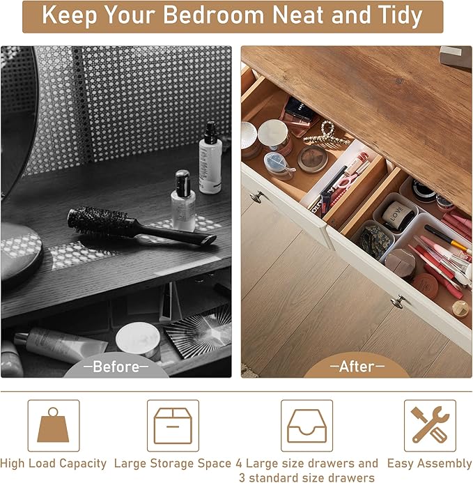 - Stable and Sturdy: Bedroom dresser is made of high-quality and durable MDF and particle board, in addition, the 1-inch thick table top and 3.34-inch high wooden support base ensure this wood dresser has excellent stability, durability and large Load-bearing capacity. ( it can support up to 100 pounds on the tabletop).