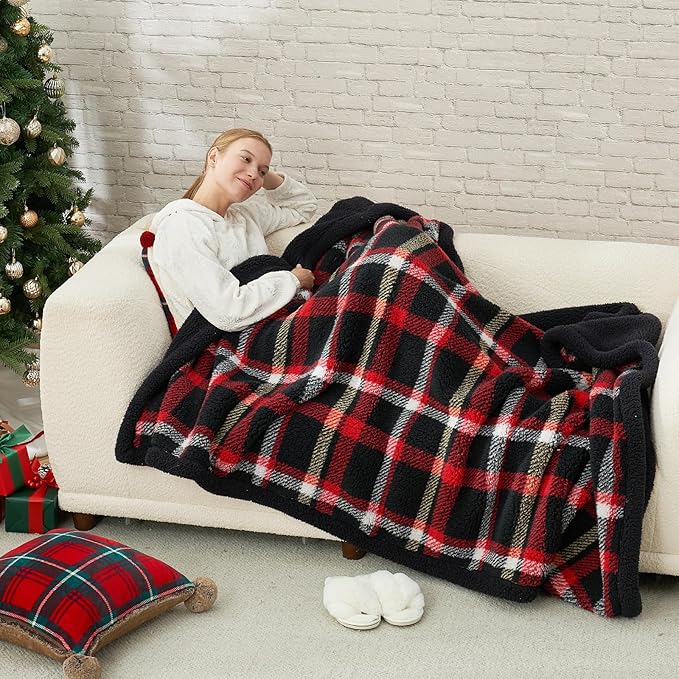 Cozy Bliss Ultra Soft Reversible Double Sherpa Sided Blanket, Buffalo Plaid Throw Blanket Fluffy Thick Warm Plush Fuzzy Blanket for Couch, Bed and Gifts (Scotland Plaid Red, 50" x 60")