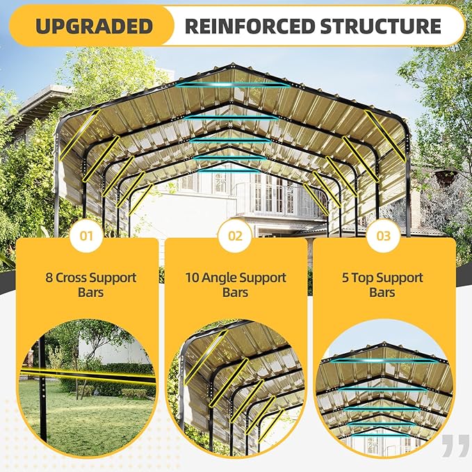 - Sturdy and Durable: The upgraded EROMMY 14'x25' carport features a 0.5mm thick galvanized steel roof and 24 powder-coated 2"x2" steel posts, offering excellent corrosion resistance. Additionally, the carport is equipped with 28 support rods, further enhancing the stability of the roof and metal frame, effectively preventing collapse