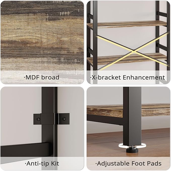 - Anti-Tip Kit: Tipover Resistance Device and 4 adjustable floor protective footpads are included for safety. These features provide added stability and prevent the bookshelf from tipping over, protecting your belongings from damage
