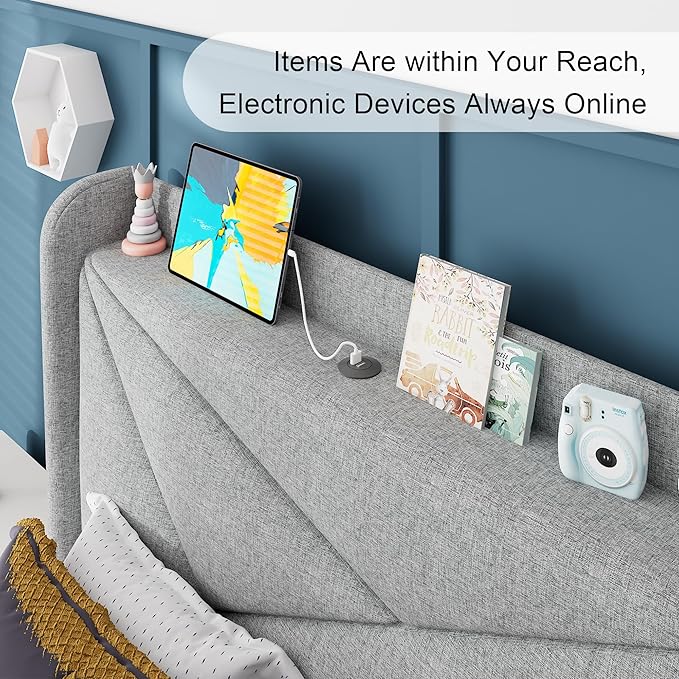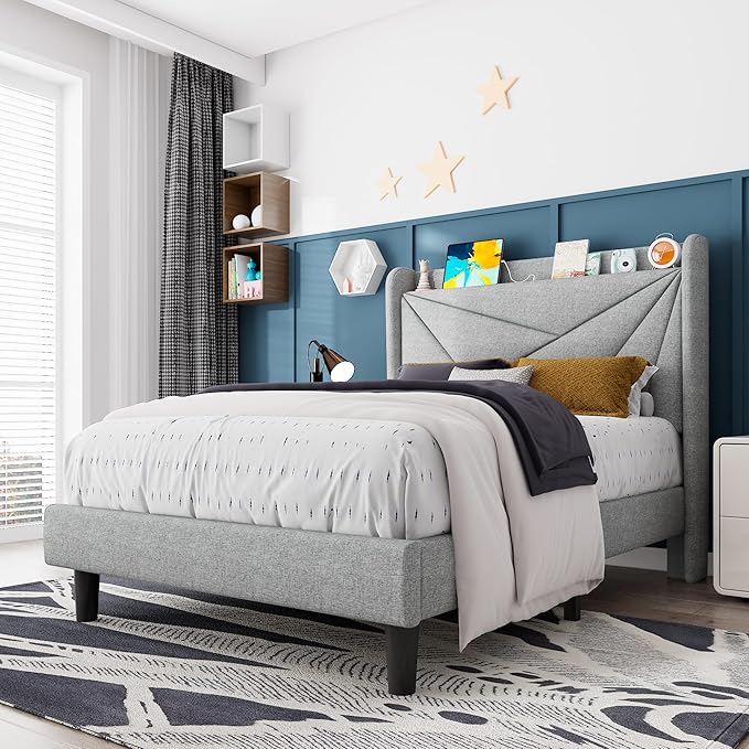 Feonase Twin Bed Frames, Upholstered Bed Frame with Charging Station, Wingback Storage Headboard, No Box Spring Needed, Noise-Free, Light Gray