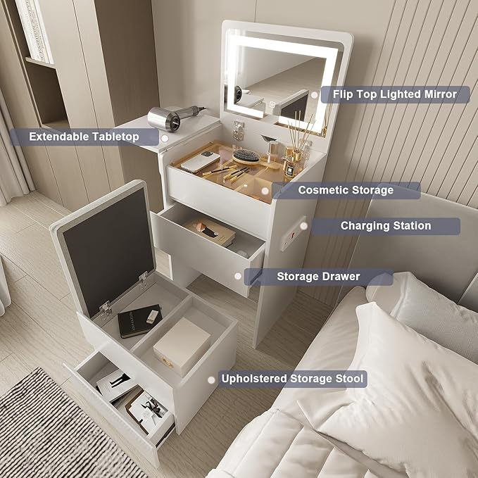 Vanity Desk with Flip Top Lighted Mirror, Compact Makeup Table with Storage Stool, Integrated Vanity with Drawers, 3-in-1 Vanity Desk Set, Small Dressing Table for Bedroom (White)