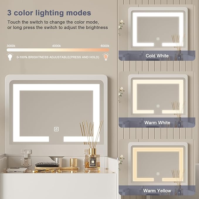 - 【3 Color LED Makeup Mirror】- This flip-Top mirror makeup vanity provides 3 lighting effects, which can switch between natural light, cold light and warm light. Then you can choose the light you want according to different scenes and different makeup.