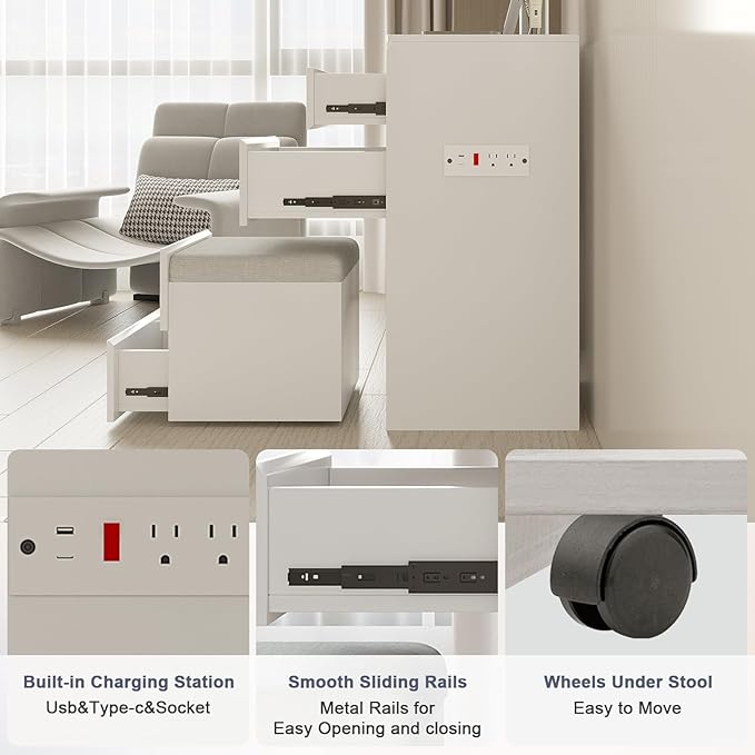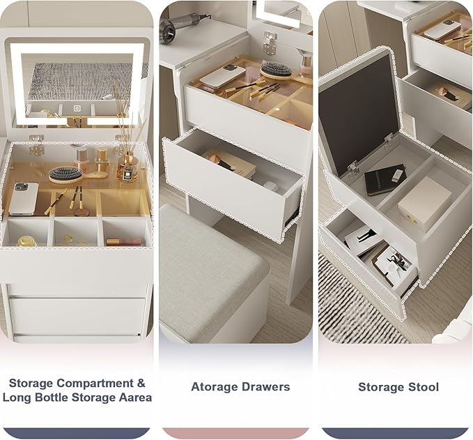 - 【High-Quality Materials】- The dressing table adopts paintless and odorless paint free board, which is wear-resistant, scratch resistant, waterproof, and has strong load-bearing capacity. Equipped with an integrated telescopic makeup stool, it is made of high-quality microfiber leather fabric and filled with high-density sponge