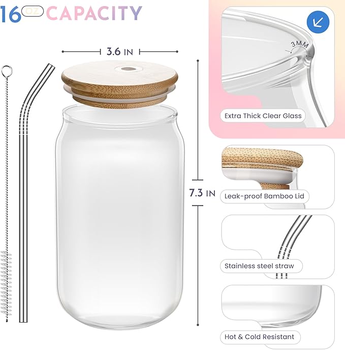 - Comes with a gift box: Package includes 1 x aesthetic glass cup, 1 x bamboo lid, 1 x stainless steel straw, 1 x straw brush. Packed in a beautiful gift box and protect well by 2pcs sponge mats. This glass is easy to carry around for indoor or outdoor use, and is also a great alternative to disposable cups and bottles, making it a practical choice for everyday use.