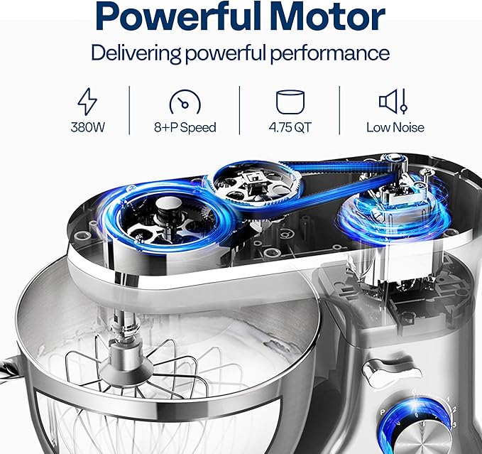 - POWERFUL MOTOR: Equipped with a high-performance 380-watt motor, this stand mixer ensures effortless and consistent whipping, beating, kneading, and thorough mixing; The all-metal gears provide stability and quiet operation (noise level ≤ 76dB); The planetary mixing design moves the beaters around the bowl for even and thorough mixing