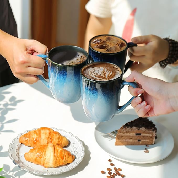 - 【UNIQUE GLAZE】: Active glazes can create stunning color arrays.Star Blue reaction glaze combined with Black gradient brings you into a starry experience..They are both interesting and creative. Every ceramic coffee cup is unique.