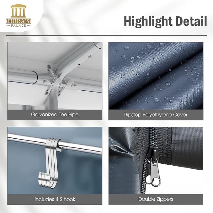 - Heavy Duty Metal Frame: The storage shed is crafted with a galvanized steel frame design, secured with elastic balls locking the canopy fabric. The steel frame has a square base plate for added stability. The canopy fabric is made of 180 g PE material, waterproof, sun-resistant, and durable in harsh weather conditions. It includes 4 S-hooks for hanging small items