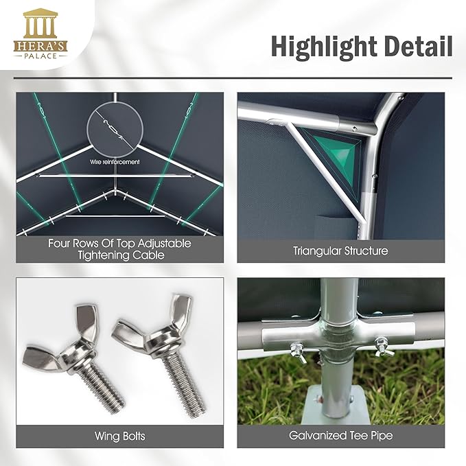 - Heavy-duty Metal Frame: The garage kit tent is constructed with a high-quality galvanized steel frame design. The top is reinforced with 5 crossbars to form a stable triangular structure. 2 iron cables are added on each side of the top for additional reinforcement, significantly increasing its load-bearing capacity. Inside, there are four S-hooks (bearing weight 6-11 pounds), convenient for hanging and storing small items