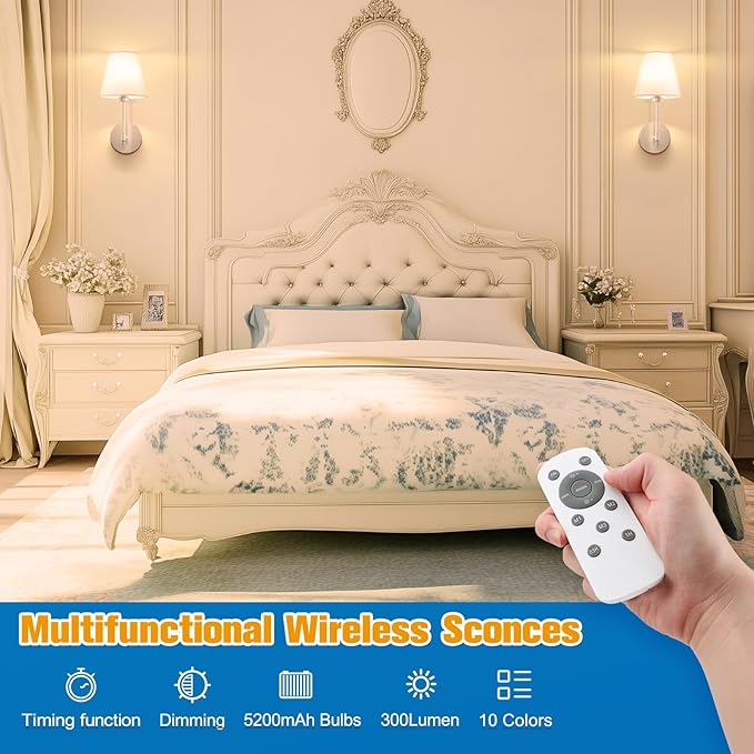 - 【Remote Control & Easy operations】Wireless sconces set of 2 take full control of your lighting experience with the included remote. Easily customize brightness levels and light effects from the comfort of your couch or bed. With just a press of a button, you can create the perfect ambiance for any occasion, whether it's movie night or a cozy evening at home.