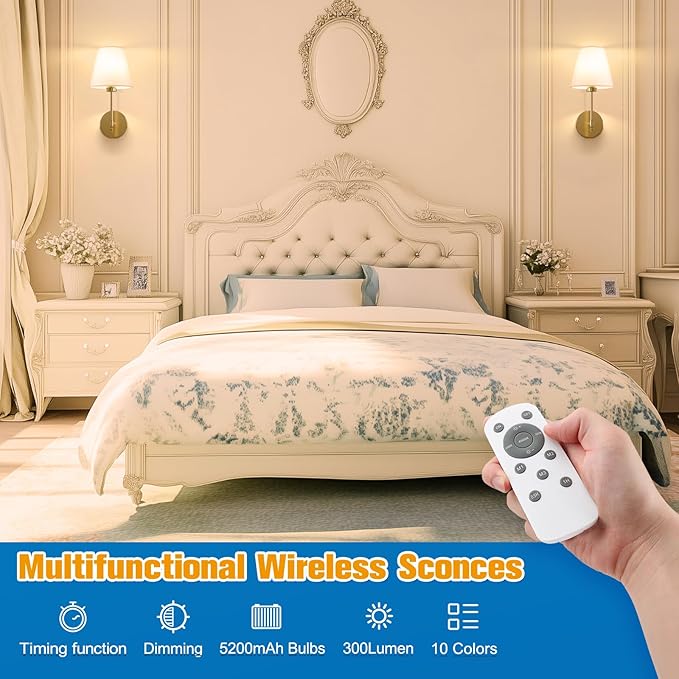 - 【Remote Control & Easy operations】Wireless sconces set of 2 take full control of your lighting experience with the included remote. Easily customize brightness levels and light effects from the comfort of your couch or bed. With just a press of a button, you can create the perfect ambiance for any occasion, whether it's movie night or a cozy evening at home.