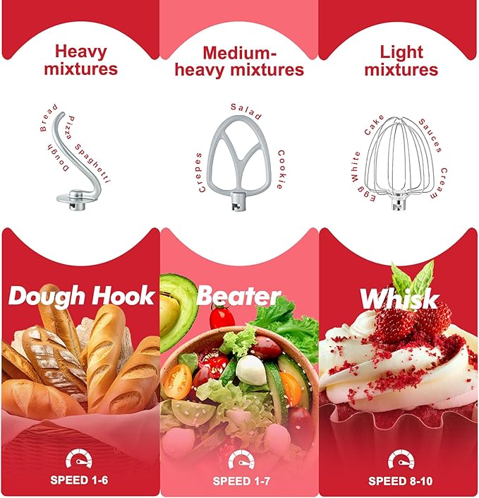 - 10 Speeds and Tilt Head Design - This Kitchen mixer has 10 different speed options,suitable for mixing bread dough, thick batters, meringues, and whipping cake cream, plus lower speeds for stirring and finessing your most delicate concoctions,could suit perfectly to different ingredients. Tilt-head design mixer allows access to install or uninstall bowls and accessories easily.