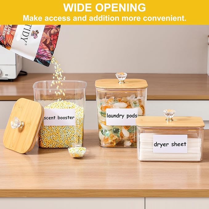 - 【Crystal Handle & 16 PCS Lables】 The stylish handle not only enhances the aesthetics of the plastic laundry organizer jar but also provides a comfortable grip, making the lid easier and more convenient to open and close. The white removable stickers and erasable black marker allow you to label items freely, customize your storage space.