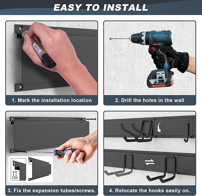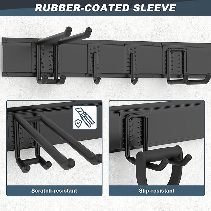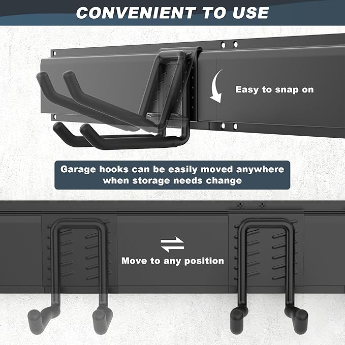 - VERSATILE AND SPACIOUS: Garage tool organizer storage systerm includes 15 different hooks to store all your tools like shovels, brooms, bikes, bags, towels,etc. Total length is 119 inches, suitable for garage, basement, shed,etc