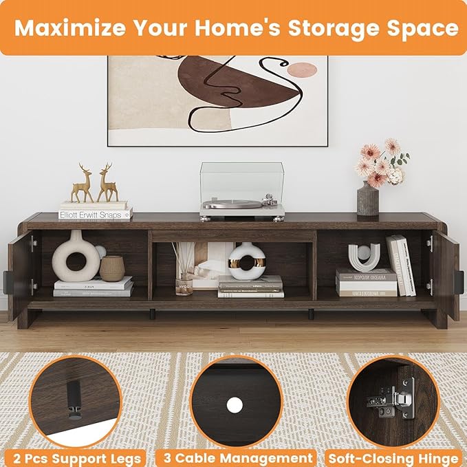 - [Ample Storage Space] This entertainment center with storage features a 63-inch wide top, providing ample space to support flat-screen TVs up to 75 inches. The two distinctive doors on either side open to reveal generous storage capacity, ideal for organizing DVDs, board games, and other accessories. The central shelf is perfectly suited for media players and gaming consoles, hile built-in cable management cutouts ensure a tidy and organized setup by concealing cords and cables