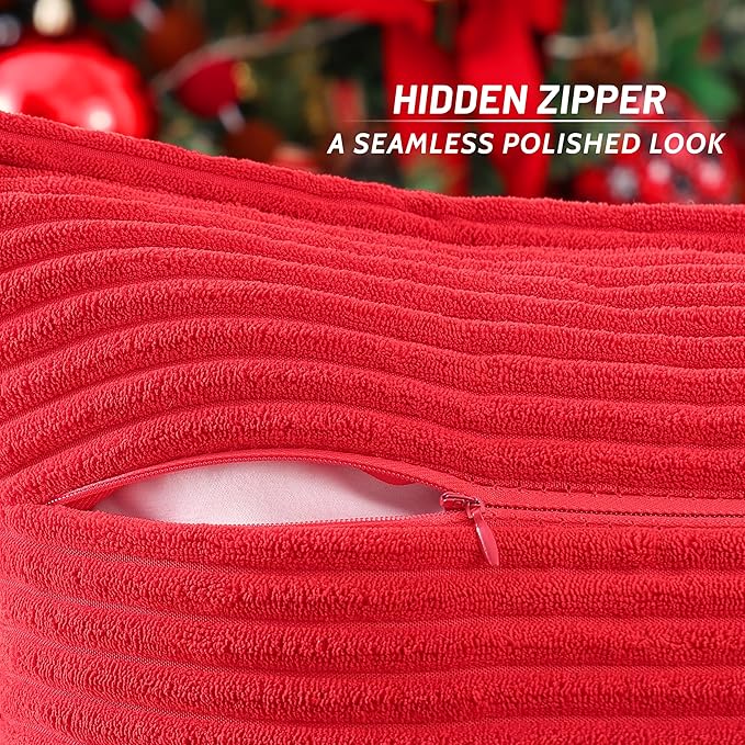 - Hidden Zipper: The timeless red pillow covers feature a hidden zipper along one edge, creating a sleek, seamless look. The generously sized opening allows easy removal or insertion of pillows for seasonal updates