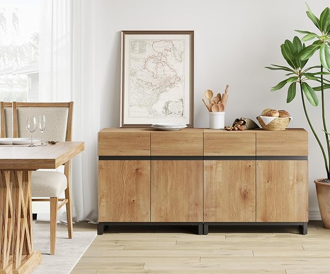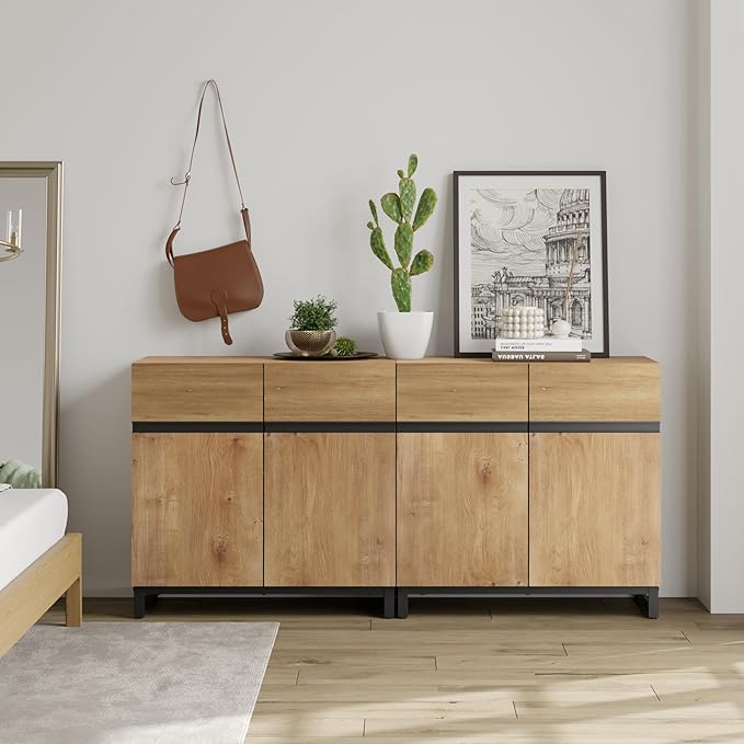 - Modern Design: This modern TV stand drawers feature concealed door handles for a neater appearance. Adorned with a oak grain design, it seamlessly complements various decor styles, from modern simplicity to American country and tranquil pastoral themes. It's an excellent addition to elevate your home's aesthetic.