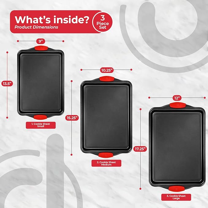 - HIGH-QUALITY CARBON-STEEL & HEAT-RESISTANT HANDLES: Made of excellent quality carbon steel materials, these non-toxic baking pans will remain in great condition for years. Plus, they come with heat-resistant red silicone handles for comfortable use.