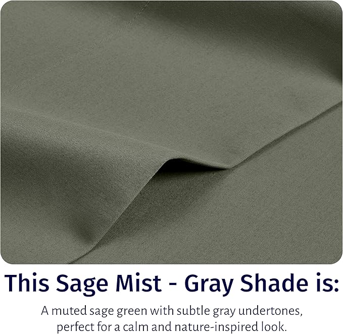 - About this Shade & 4-Piece Sheet Set: This shade is a muted sage green with subtle gray undertones, perfect for a calm and nature-inspired look. Set includes 1 flat sheet (112" W x 104" L), 1 deep pocket fitted sheet (78" W x 80" L fitting mattresses up to 16” deep), and 2 king size envelope-closure pillowcases (21" W x 36" L) to fit king size pillows. Anti-skid elastic and directional tags make bed-making quick and easy.