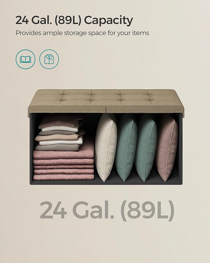 - 【AMPLE SPACE】Sized at 15"D x 30"W x 15"H (38 x 76 x 38 cm), this storage bench offers a 24-gallon (89 L) capacity for books, blankets, and more. With its flipping lid, you can easily access the items stored in the ottoman