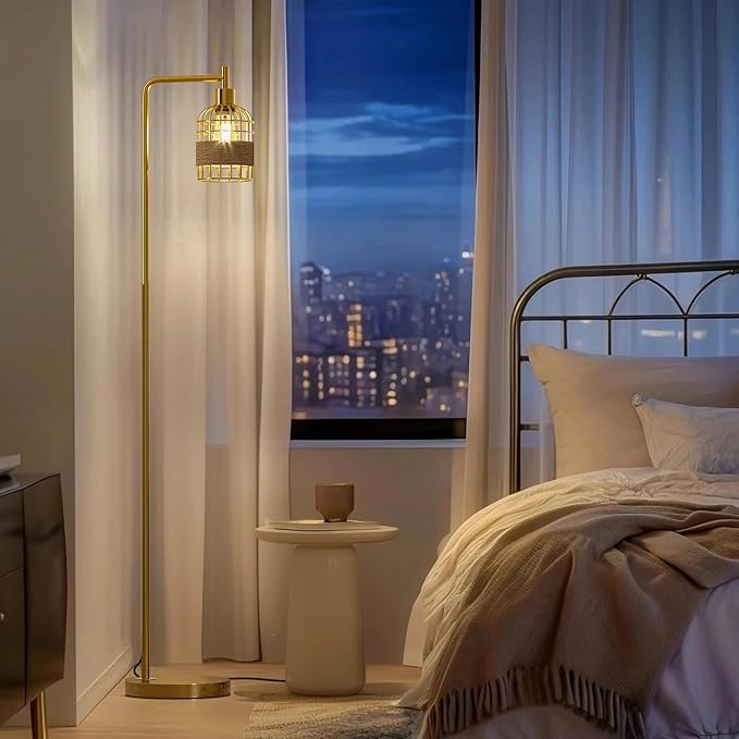 - Simple Design Gold Floor Lamp: This 66 inch gold floor lamp features a sleek and minimalist design, making it a perfect complement to various decor styles in your living room, bedroom, study, restaurant, or office. We have designed 3 different lampshades for selection, you can choose from glass shade, rattan shade, or cage shade with paper rope wrapped around the metal, just depending on your preference or your individual needs