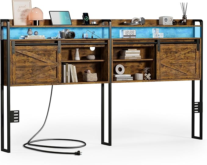 wanan King Size Headboard with Storage, 3 Tier, LED Light, Sliding Barn Doors, Width Adjustable (Rustic Brown, King)
