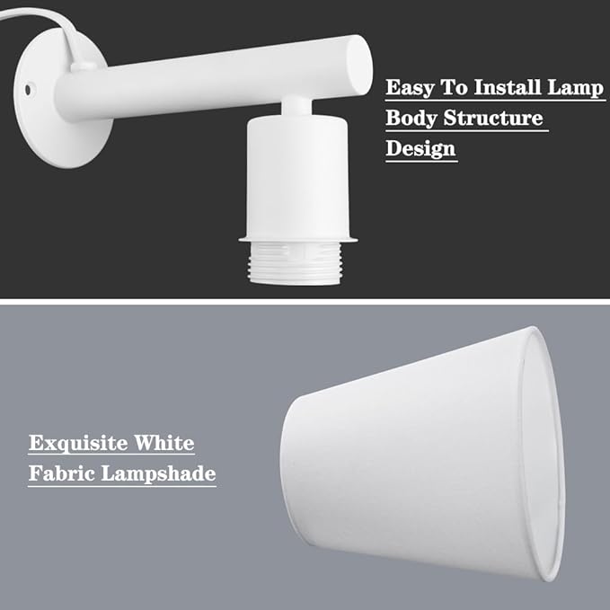 - 【Upgraded Plug in Wall Sconces】Modern wall light with plug in cord feature a matte white lamp body accompanied by white fabric shade. Upgraded finish includes scratch and tarnish-resistant coating, ensuring the lamp maintains pristine appearance over time