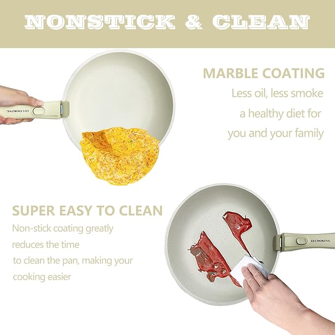 - EASY STORAGE: 11 pcs nonstick cookware set is space-saving when stacked with the removable handles removed.