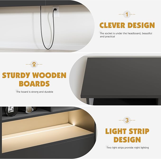- 2 LED Lights-THE bookcase headboard with 2 LED lights, catering to your nighttime lighting needs. The industrial-style wooden storage headboard, combined with modern LED lights, adds a vibrant touch to your room.