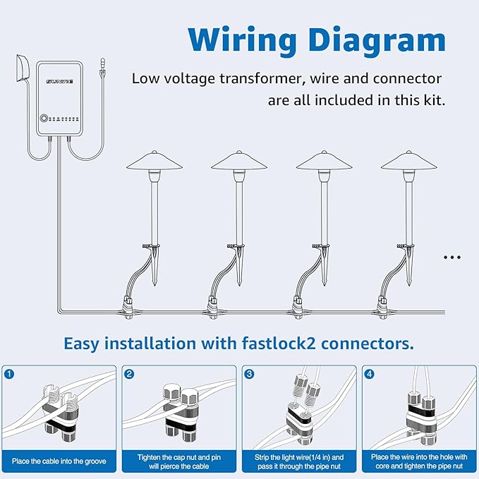 - 【Flexible Lighting Layout】Unlike other kits with fixed length male and female plug cords, with our kit you can place each light anywhere along the 100 feet of low voltage wire. And no need to worry about wiring, the included SUNVIE patented fastlock2 connectors make it a breeze. 30-day money-back guarantee, 24-month replacement warranty and lifetime after-sales support guarantee. Buy with confidence.