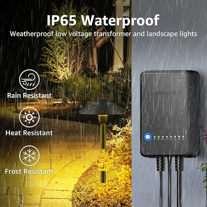 - 【Dusk to Dawn & Countdown Timer】This kit is equipped with an IP65 outdoor 60W landscape lighting transformer with photocell sensor and countdown timer. Just press the button to select and cycle different modes easily. When set the AUTO mode the landscape lighting transformer will turn on at dusk and off at dawn; When set 2/4/6/8/10 hours countdown it will automatically turn on at dusk and turn off 2/4/6/8/10 hours later.